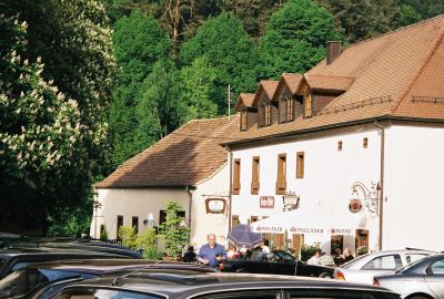 Nun orientieren wir uns nach der Markierung gelbes Kreuz, überqueren die Wallhalb und die Fahrstraße gehen nach rechts auf dem Waldpfad parallel zur Fahrstraße und biegen nach 350m links in die Waldschlucht ein. Mit unserem Wegezeichen gelangen wir zur Aspenhöhe, gehen 150m nach rechts auf der Fahrstraße biegen dann links ab und kommen über den Brandweinkopf zur Weihermühle (Gaststätte mit Einkehrmöglichkeit) Mit dem Schauerbach wandern wir auf der Asphaltstraße abwärts und queren bei der Weismühle (Hinweisschild) das Bächlein und biegen in das Einöder Tal ein.
